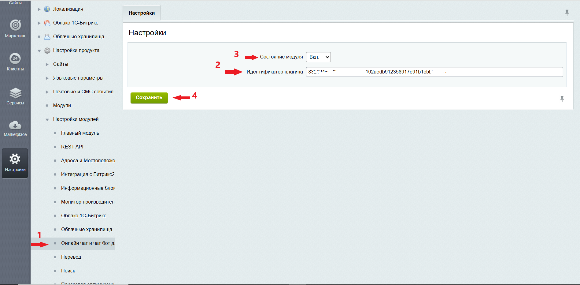6. Вернитесь в 1с битрикс, перейдите в административную панель своего сайта и откройте "Настройки" > "Настройки продукта" > "Настройки модулей" >"Онлайн чат и чат бот для сайта - ChatAndBot". В поле "Идентификатор плагина" вставьте скопированное значение, а поле "Состояние плагина" поменяйте на "Вкл.". Нажмите кнопку "Сохранить" и чат появится на сайте.