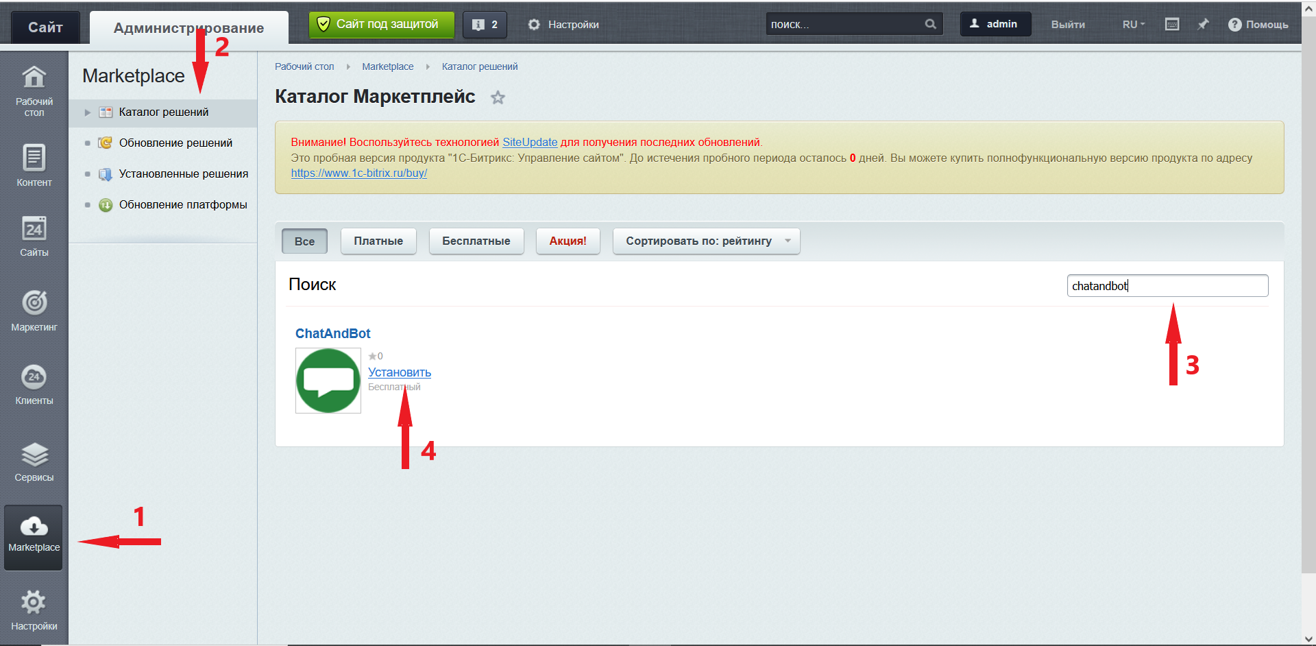 1. В административной панели 1с Битрикс перейдите в "Marketplace" >"Каталог решений" затем в поле фильтра напишите "chatandbot" и найдите модуль. После того как модуль будет найден - нажмите "Установить".