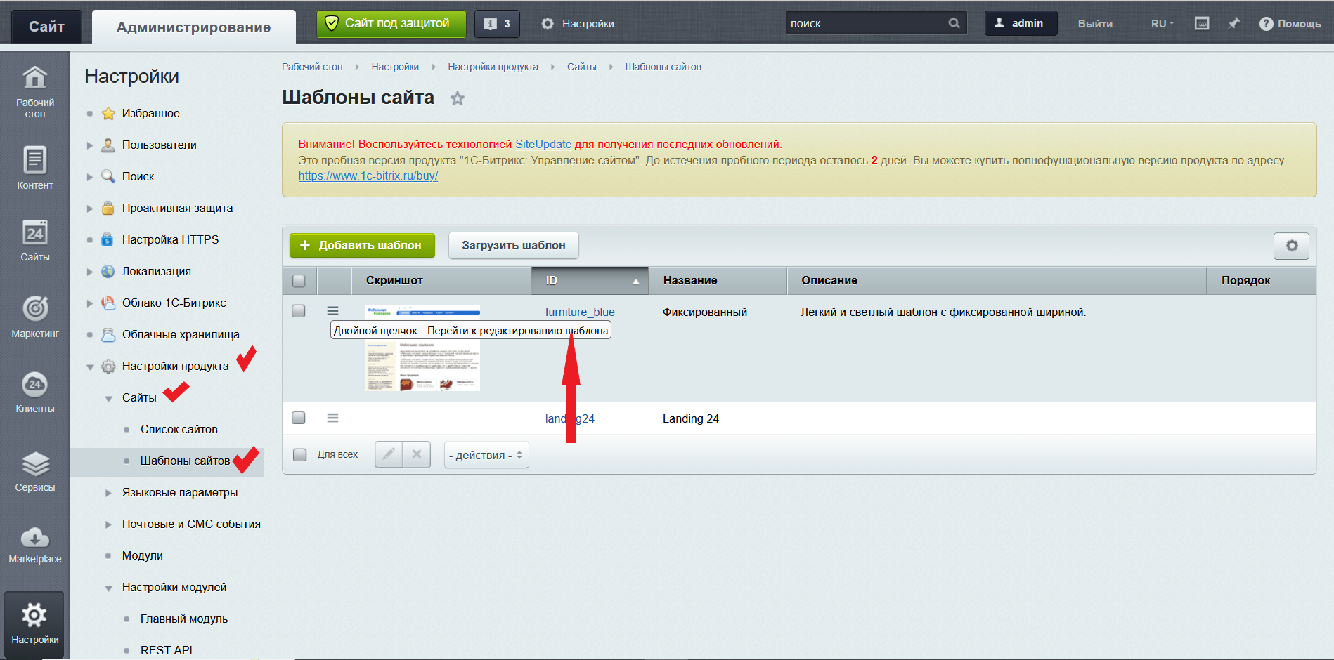 5. Вернитесь в 1с битрикс, перейдите в административную панель своего сайта и откройте "Настройки" > "Настройки продукта" > "Сайты" >"Шаблоны сайтов", а затем откройте нужный шаблон на редактирование.
