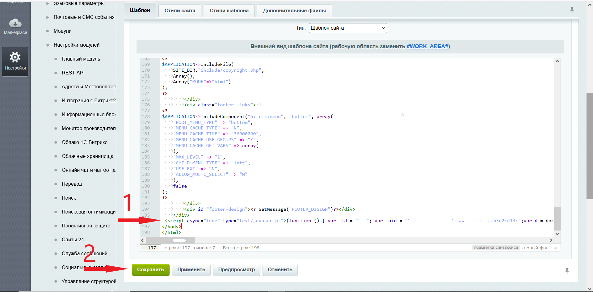 6. В html коде Вашего шаблона, найдите тэг </body> (он будет в самом низу) и вставьте перед ним скопированный в 4 пункте код. Затем нажмите кнопку "Сохранить". Чат должен появиться на сайте.